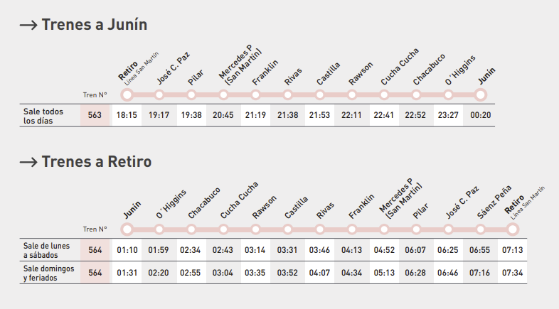 Todos los días hay trenes que conectan Retiro con Junín y viceversa. El viaje tiene una duración aproximada de 5 horas y 30 minutos, ofreciendo un traslado cómodo y seguro entre ambas cabeceras.